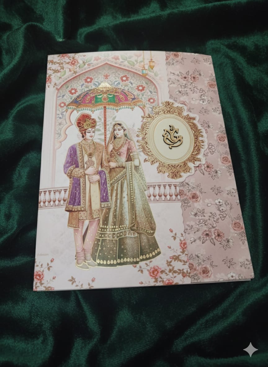 Regal & Traditional: A rich, traditional Indian wedding card with a striking gold-on-maroon color palette and classic regal artwork.