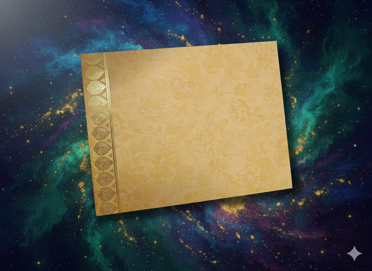 The lower half is adorned with a decorative scalloped border above a contemporary geometric jaali (net/lattice) pattern, where cut-out shapes are backed by glittering gold foil. The overall effect is sophisticated, radiant, and deeply traditional, making it a perfect announcement for a memorable even