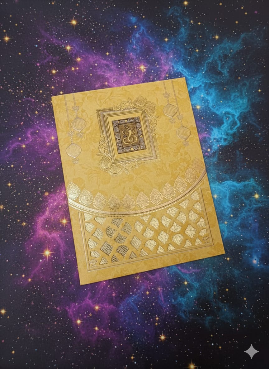 An incredibly vibrant saffron yellow wedding invitation that radiates celebration. It features intricate gold foil embossing in a geometric jaali pattern and a sacred Ganesha motif at the center, perfectly capturing the joy and auspiciousness of a traditional Indian wedding.