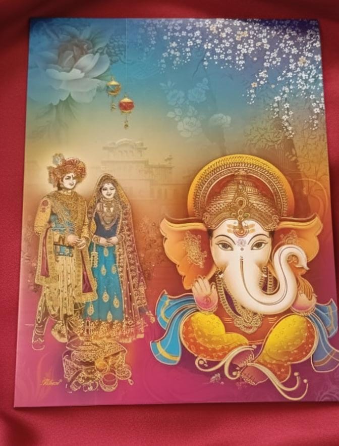 Embrace the grandeur of tradition with this exquisite multi-fold wedding invitation. Featuring a divine illustration of Radha-Krishna on one side and a majestic royal elephant procession on the other, this cream and gold card is accented with intricate floral mandalas and a unique scalloped edge. Perfect for couples seeking a blend of spirituality and royal elegance for their big day.