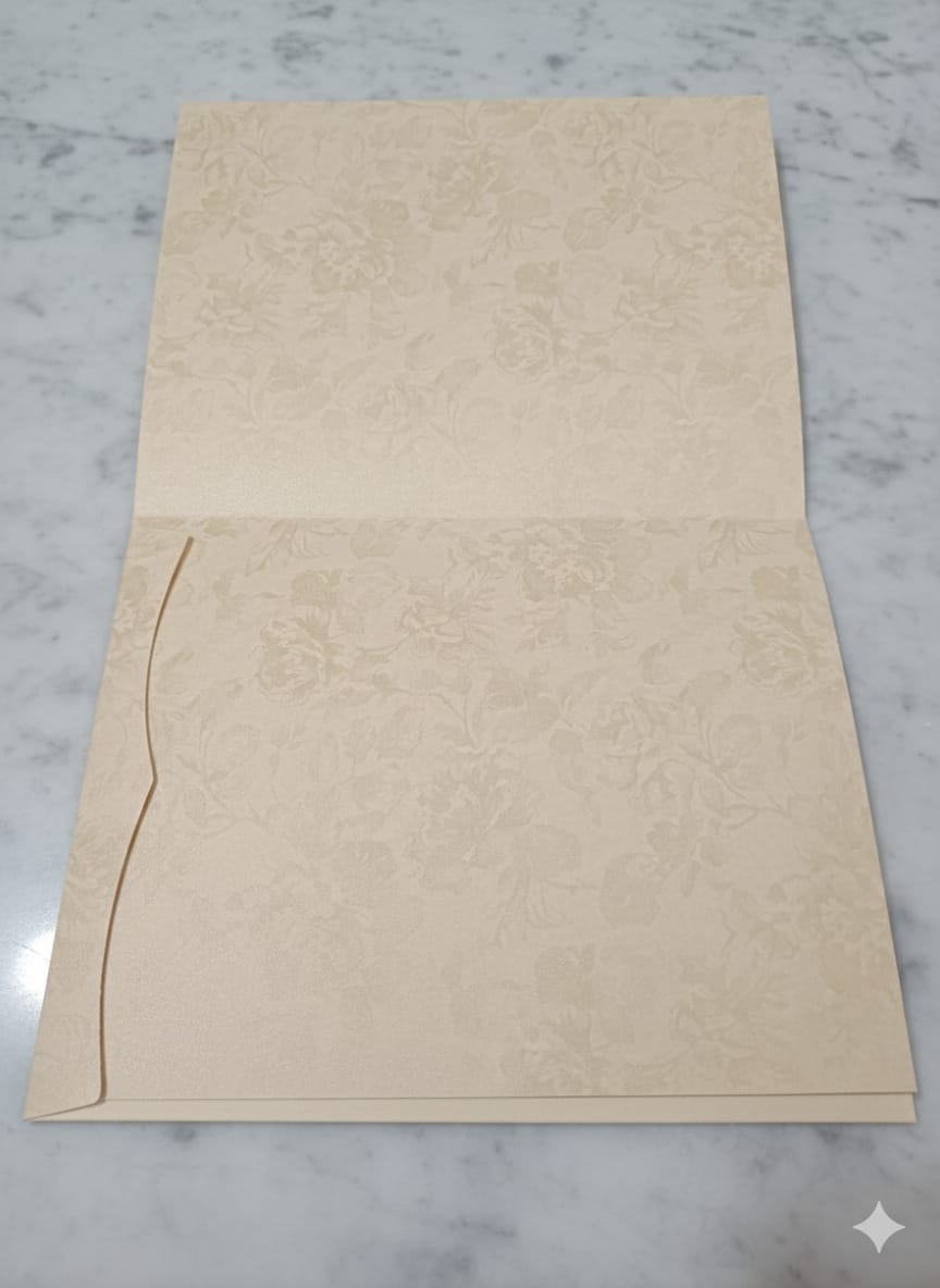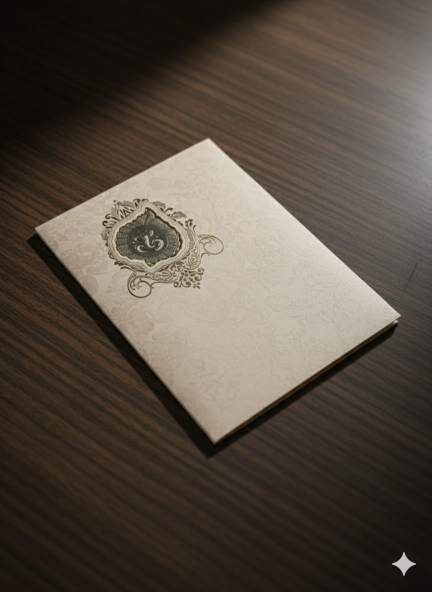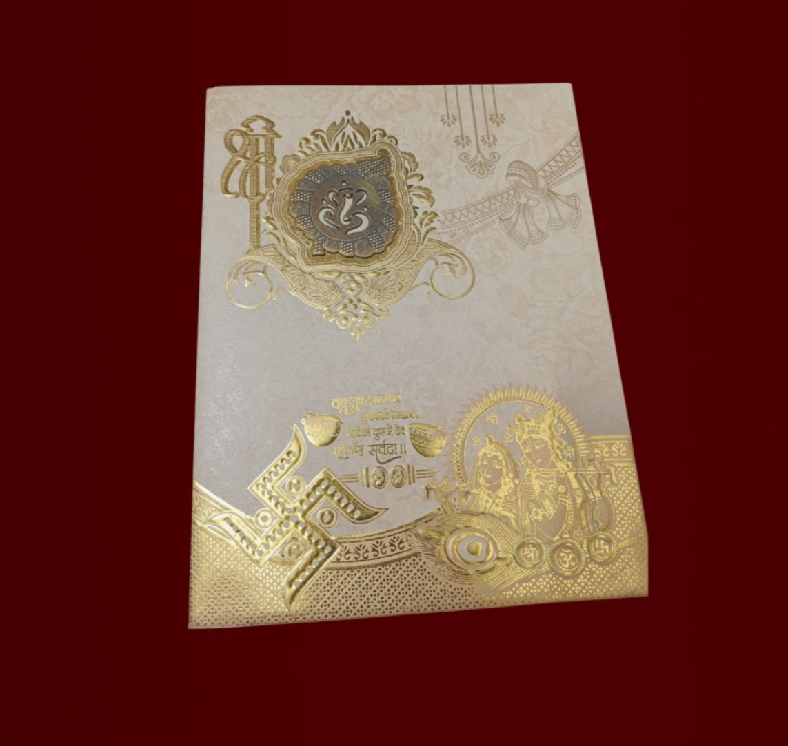 Overall Impression: The elaborate foil stamping and embossing techniques create a sophisticated, tactile, and shimmering appearance. It perfectly conveys the auspicious and celebratory nature of a traditional Indian wedding.