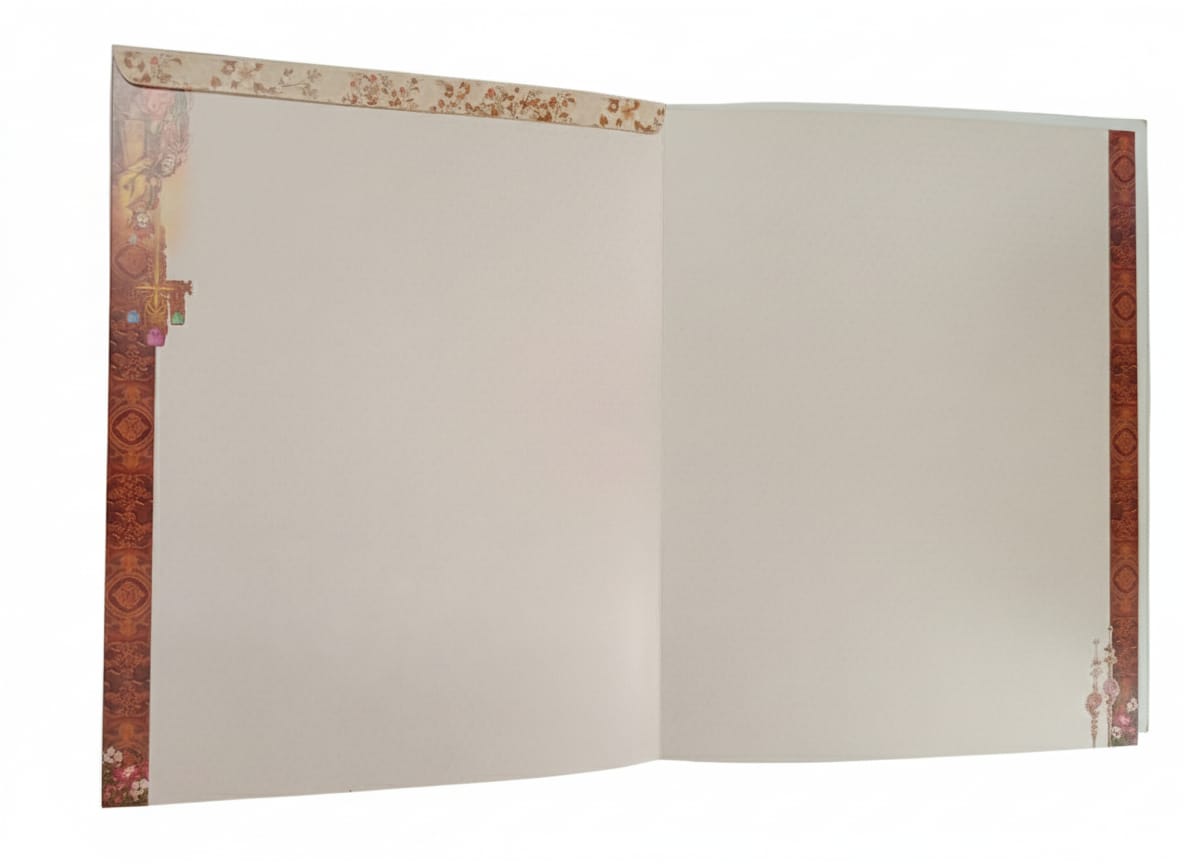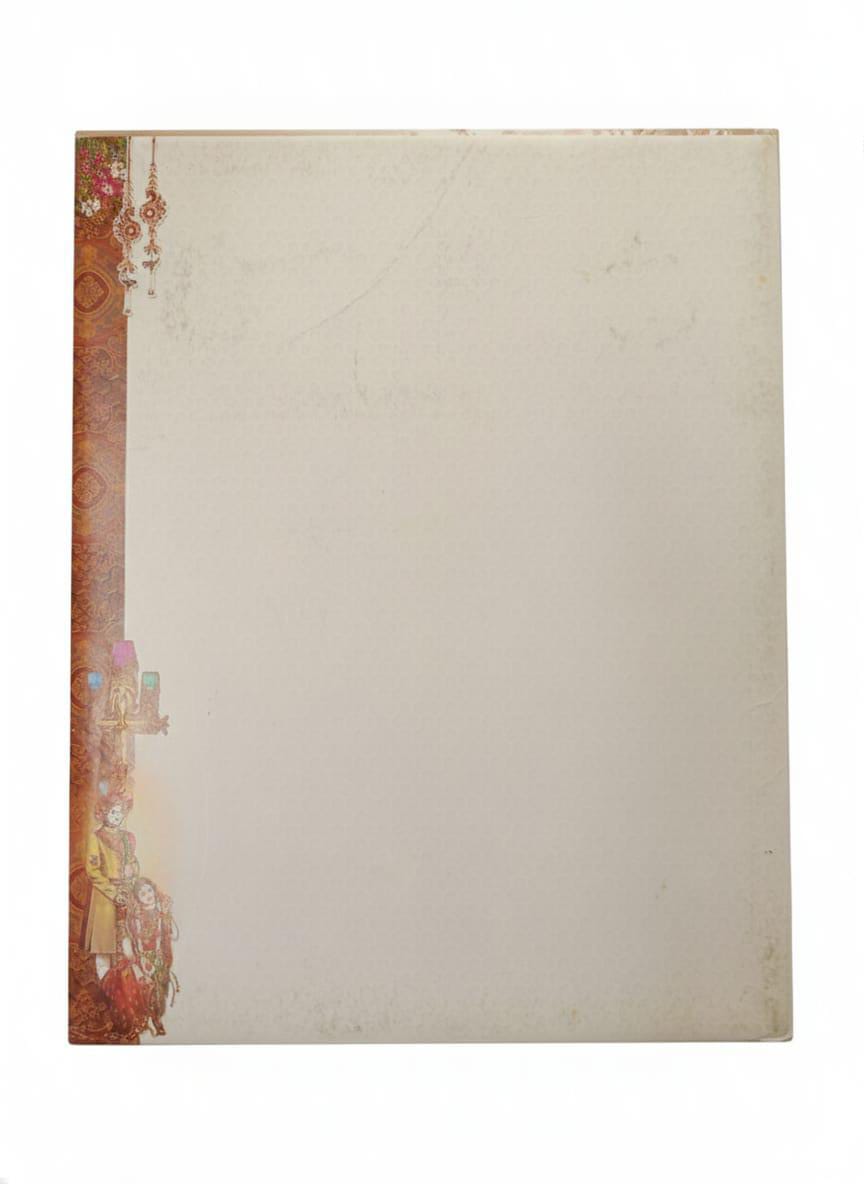 A square or rectangular piece of light-colored, blank paper or card stock with decorative elements along the top edge. The top border features a band of patterned design in shades of brown and gold, with a montage of small, colorful, possibly Indian-style illustrations (such as figures, gifts, or floral motifs) clustered primarily in the upper left and upper right corners. The main body of the paper is a plain, off-white or light beige color.