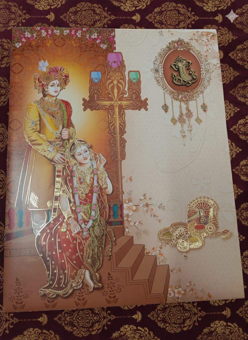 Embossed Gold Work: Significant portions of the image, including the couple’s jewelry and clothing details, the surrounding motifs, and the Ganesha medallion, appear to be embossed or raised with bright gold foil stamping, adding texture and opulence.